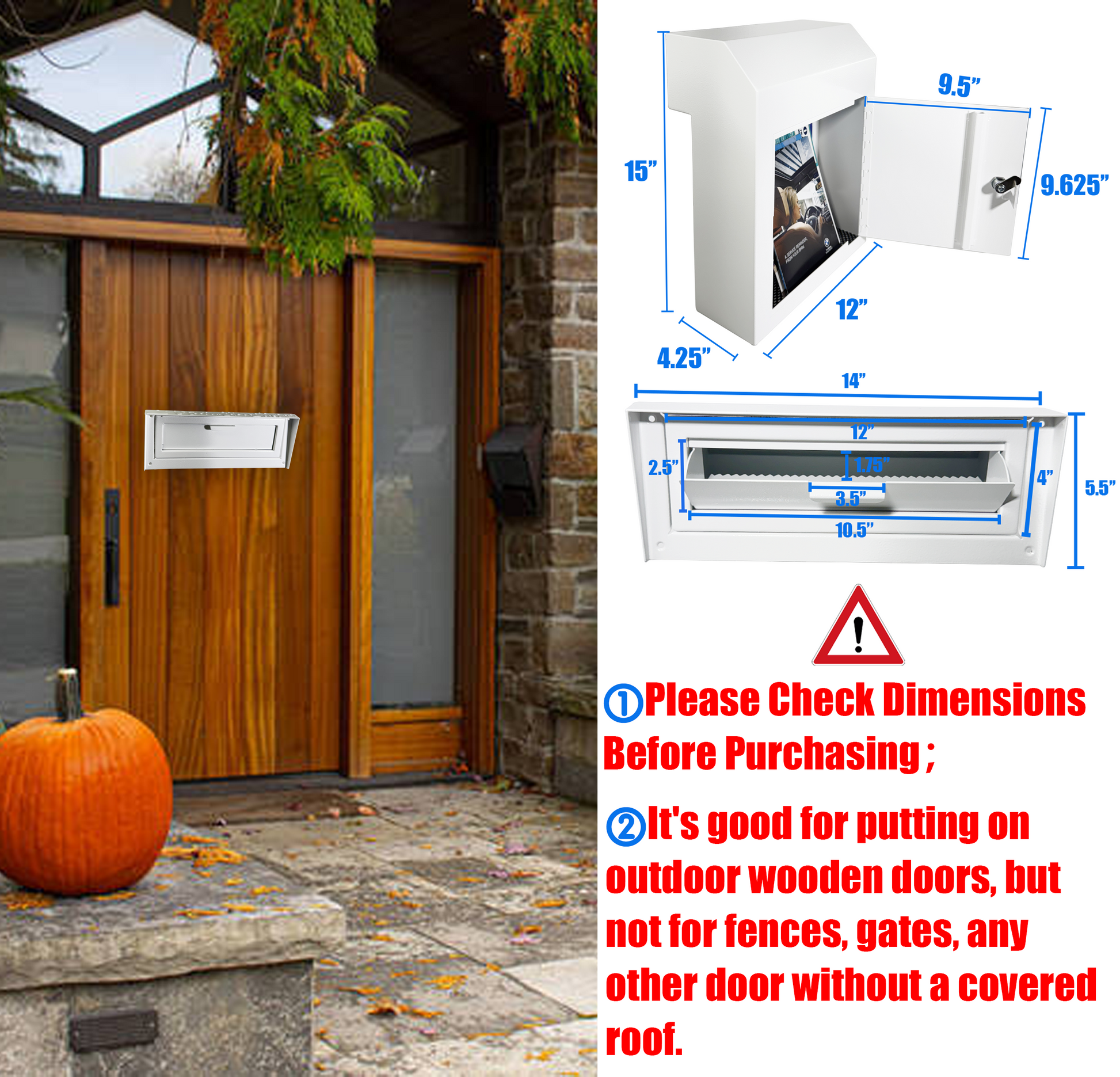 - AMPLE STORAGE CAPACITY: Our door drop box boasts dimensions of 12''(L) x 4.25''(W) x 15''(H), providing abundant room to accommodate your mail, documents, checks, envelopes, as well as small items like keys and cash. It seamlessly fulfills your everyday storage requirements.