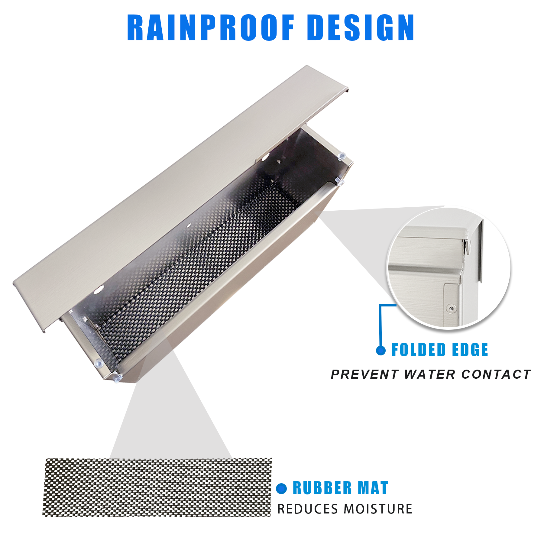 - NO MORE WET MAILS: Our waterproof mailbox has folded edges covering the top of the stainless steel wall mount mailbox, so raindrops will drip down naturally and not get inside the mail box, keeping your items clean and dry. In addition, we include a rubber mat to keep moisture away.